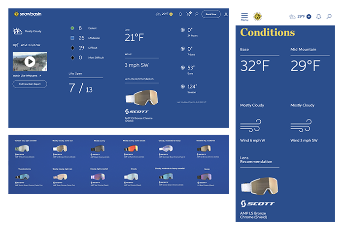 Custom designed solution for a Snowbasin and SCOTT goggles partnership. Based on weather conditions, a designated goggle rec appears in the conditions report with a link to the product.